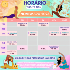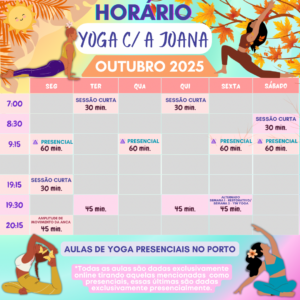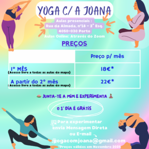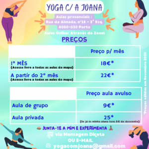Se precisar de orientações sobre yoga, ou procurar encontrar aulas, pode inscrever-se nas aulas de “Yoga com a Joana”. Seguem abaixo os documentos com a descrição do mapa de aulas e dos respetivos preços.